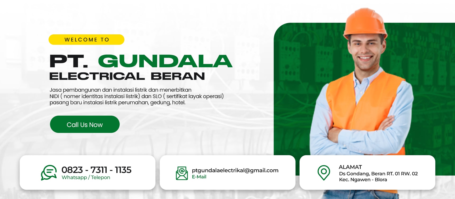 Gundala Electrical Beran merupakan salah satu perusahaan yang berfokus pada kelistrikan. Kami menyediakan layanan jasa pembangunan dan instalasi listrik, menerbitkan NIDI ( Nomor Identitas Instalasi Listrik), SLO ( Sertifikat laik Operasi), pasang baru instalasi listrik untuk perumahan, gedung, hotel, kantor, toko, ruko dan bangunan lainnya. Kami berlokasi di Jawa Tengah atau lebih tepatnya berada di Ds Gondang, Beran RT. 01 RW. 02 Kec. Ngawen – Blora.